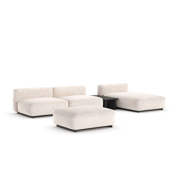 Zestaw Moodu w tej konfiguracji składa się z pięciu elementów: trzech modułów z oparciem, jednego modułu bez oparcia oraz niskiego stolika łączącego, wszystko to zaprojektowane z myślą o maksymalnym relaksie i swobodzie aranżacji.